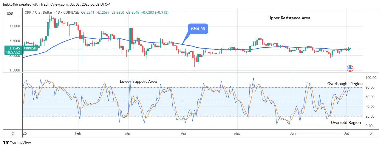 The long-term market value of XRP is moving in a bullish direction. The coin price is trading above the EMA-50 approaching the overhead resistance with huge volumes from the bulls.