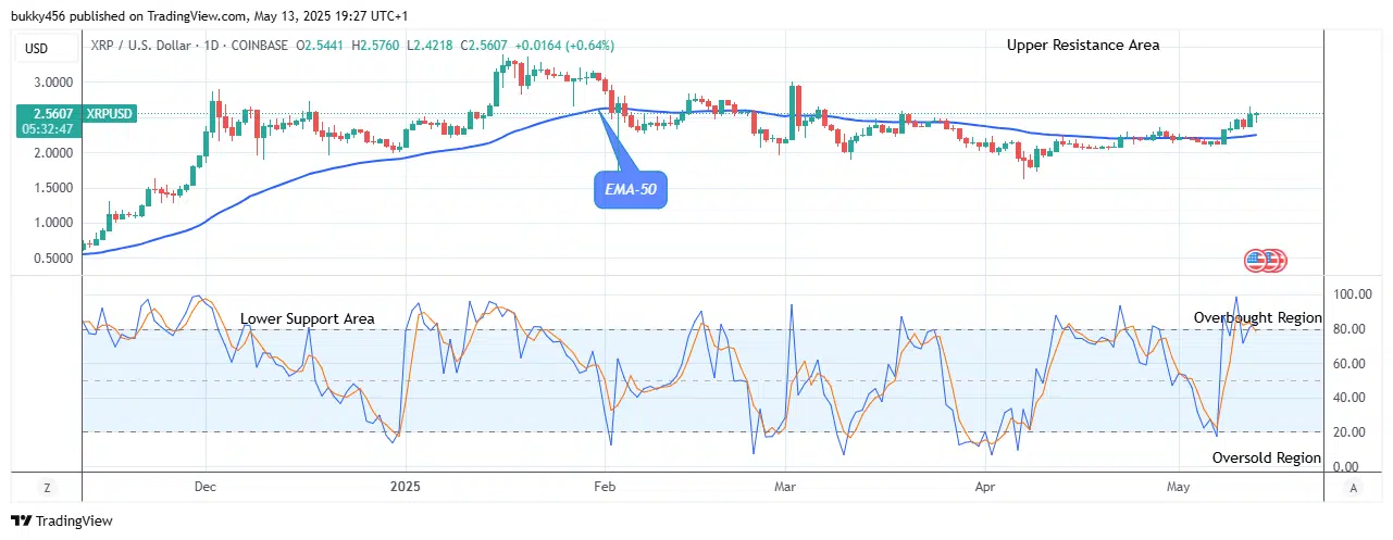 At the press time today, the market price of XRPUSD signals a bullish flag at the $2.576 supply level above the moving average-50 as the daily chart opens, implying that the price is in an uptrend, and from the way it is at the moment, it will keep growing.